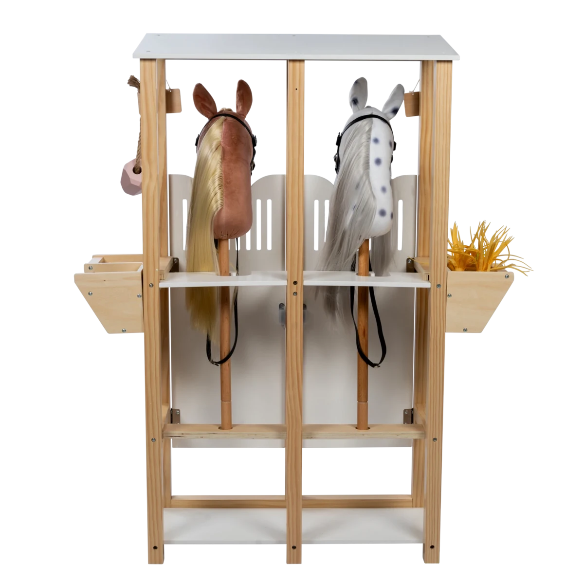 Daarnaast worden er twee kleine krijtborden meegeleverd waar je optioneel de namen van de stokpaardjes op kunt schrijven. De borden kunnen worden opgehangen aan kleine houten knoppen boven de staldeuren. Andere knoppen aan de zijkant van de stal kunnen worden gebruikt om andere accessoires op te hangen, zoals hoofdstellen, halsters, linten en andere rij-uitrusting.