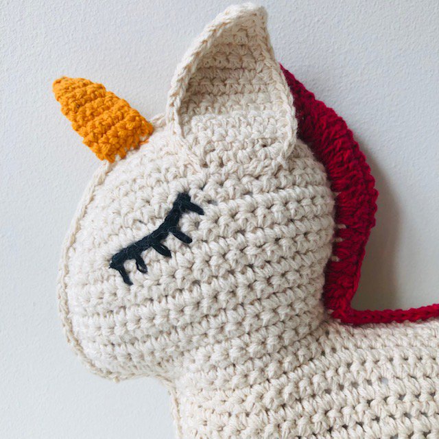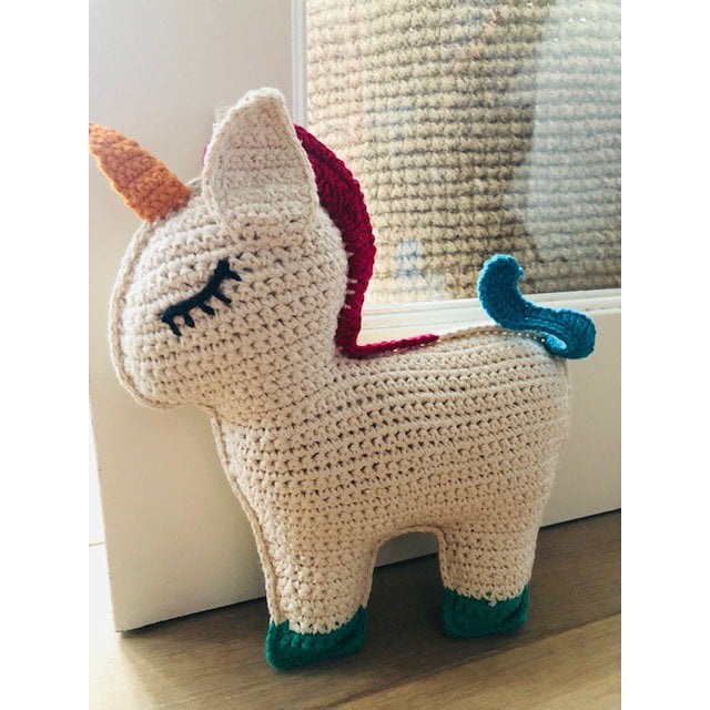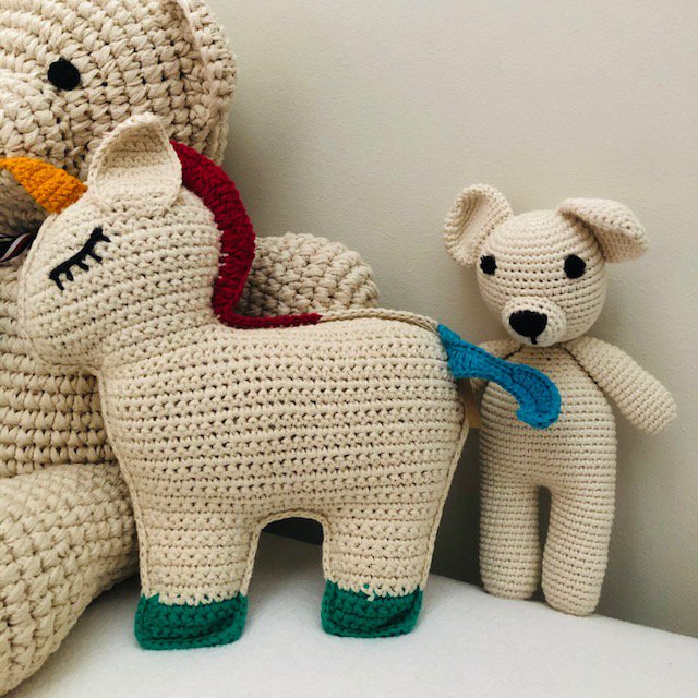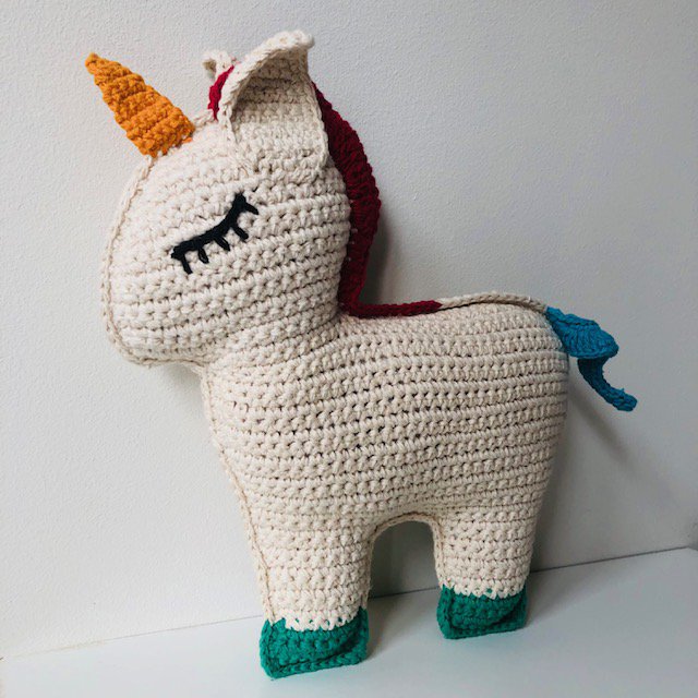 Ik ben een eenhoorn! Een duurzame eenhoorn in gebroken wit met regenboogkleuren, met de hand gehaakt door onze vrouwen in Kathmandu.