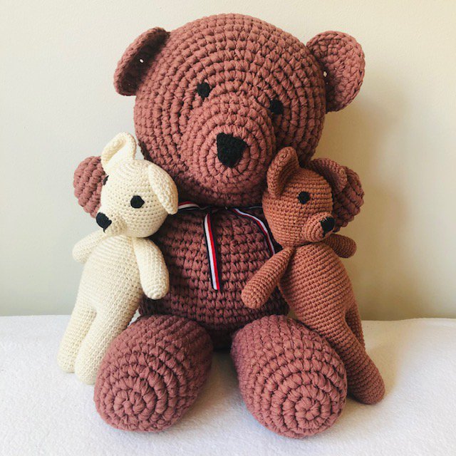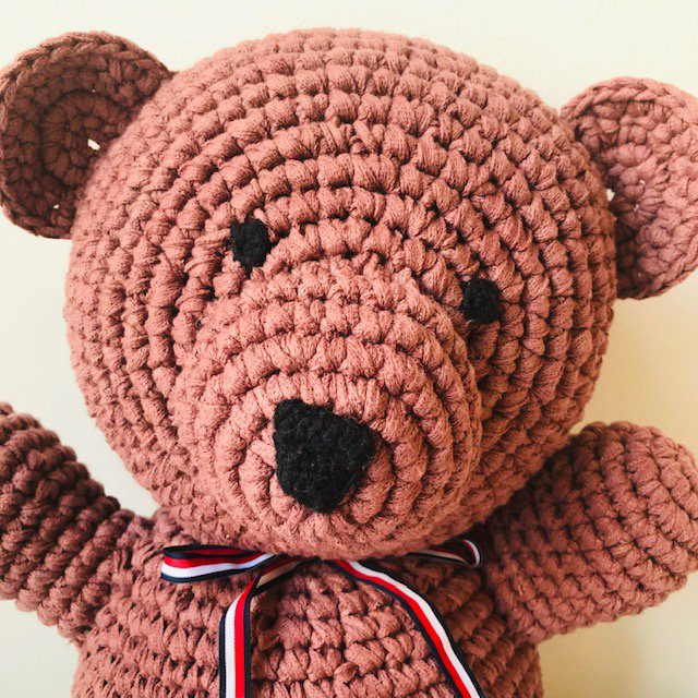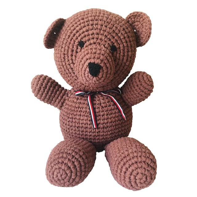 Ik ben Leena! Een duurzame grote beer in bruin met een lint in Nederlandse kleuren, met de hand gehaakt door onze vrouwen in Kathmandu.