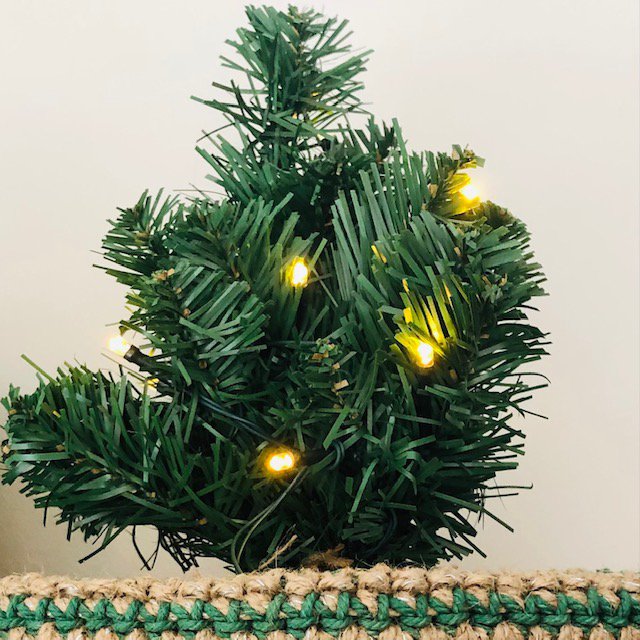 Een duurzame laag gestreepte mand in dennengroen en jute met zilver, met de hand gehaakt door onze vrouwen in Kathmandu.