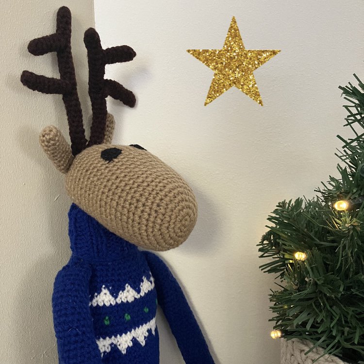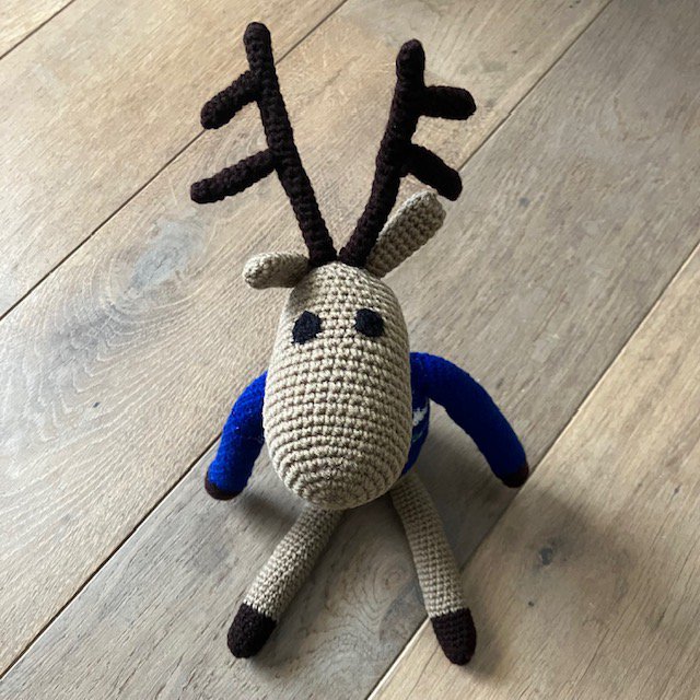 Ik ben een rendier! Een duurzaam rendier in de kleur beige en ik draag een blauwe kerstcoltrui, gemaakt van zachte wol. Met de hand gehaakt door onze vrouwen in Kathmandu.
