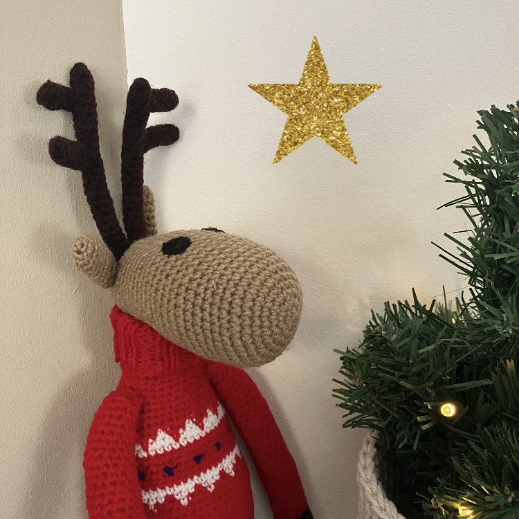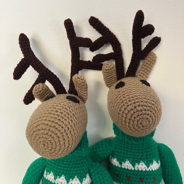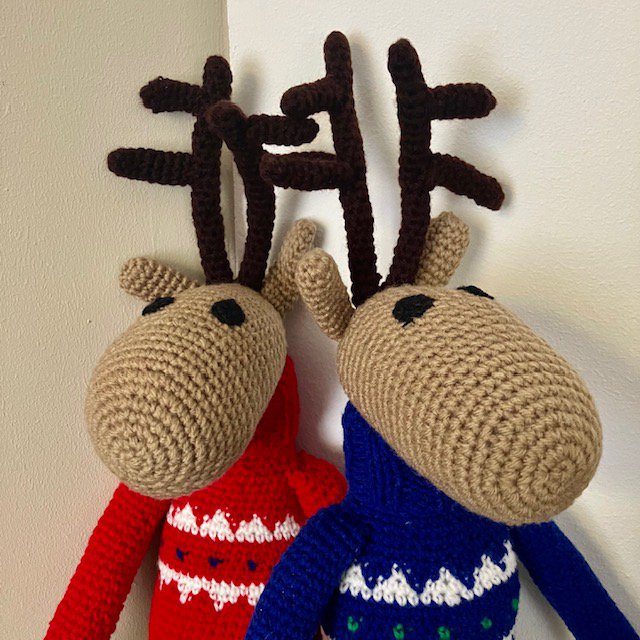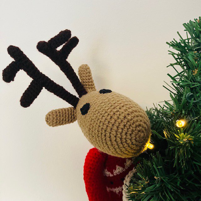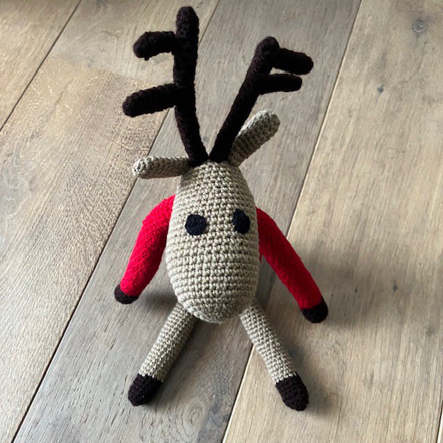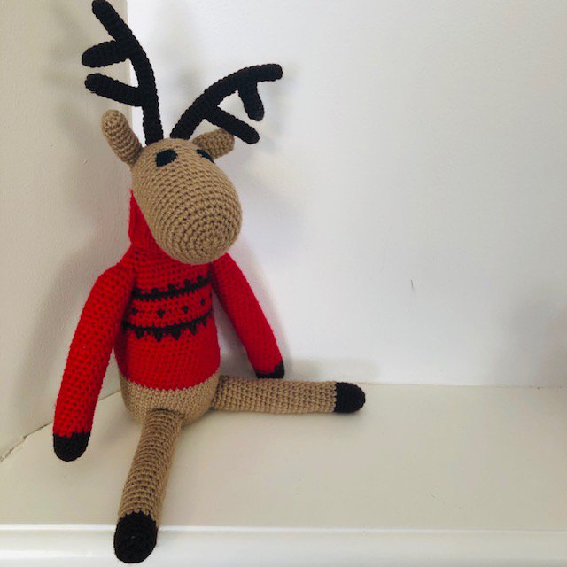 Ik ben een rendier! Een duurzaam rendier in de kleur beige en ik draag een rode kerstcoltrui, gemaakt van zachte wol. Met de hand gehaakt door onze vrouwen in Kathmandu.
