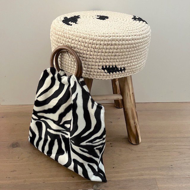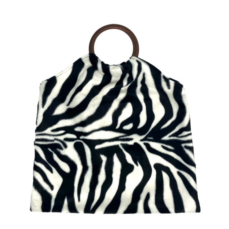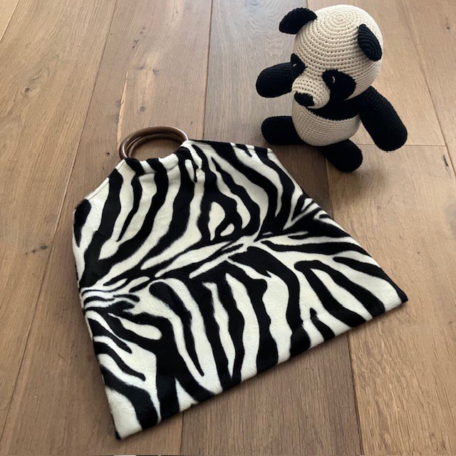 Deze tas heeft een zwart/witte zebrastreep print, is gemaakt van imitatiebont en heeft twee bruine houten handvatten.Gemaakt van overgebleven stoffen... Lees meer