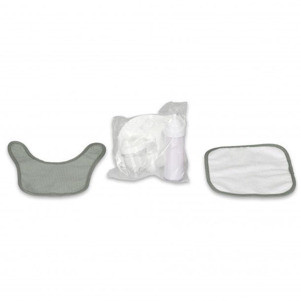 Heeft je pop melk nodig uit de zuigfles, of is het vandaag tijd voor babyvoeding? Het kan moeilijk zijn om te beslissen. Zorg ervoor dat je alles hebt wat je nodig hebt met deze uitstekende, praktische MAMAMEMO® Dolls-eetset. De tas is gemaakt van exquise corduroy en past bij de mooie luiertassen en reiswiegjes uit dezelfde serie. Hij sluit gemakkelijk met een drukknoop en is aan één kant transparant, zodat je gemakkelijk kunt zien wat je hebt ingepakt. Het heeft ook een klein handvat aan de bovenkant, waardoor het extreem gemakkelijk te vervoeren is - perfect voor elke reis. De set bestaat in totaal uit 7 delen: slabbetje, washandje, zuigfles met imitatiemelk, drinkbeker met tuit, vork, lepel en vakkenbord. Afmetingen tasje: 15x7x16cm