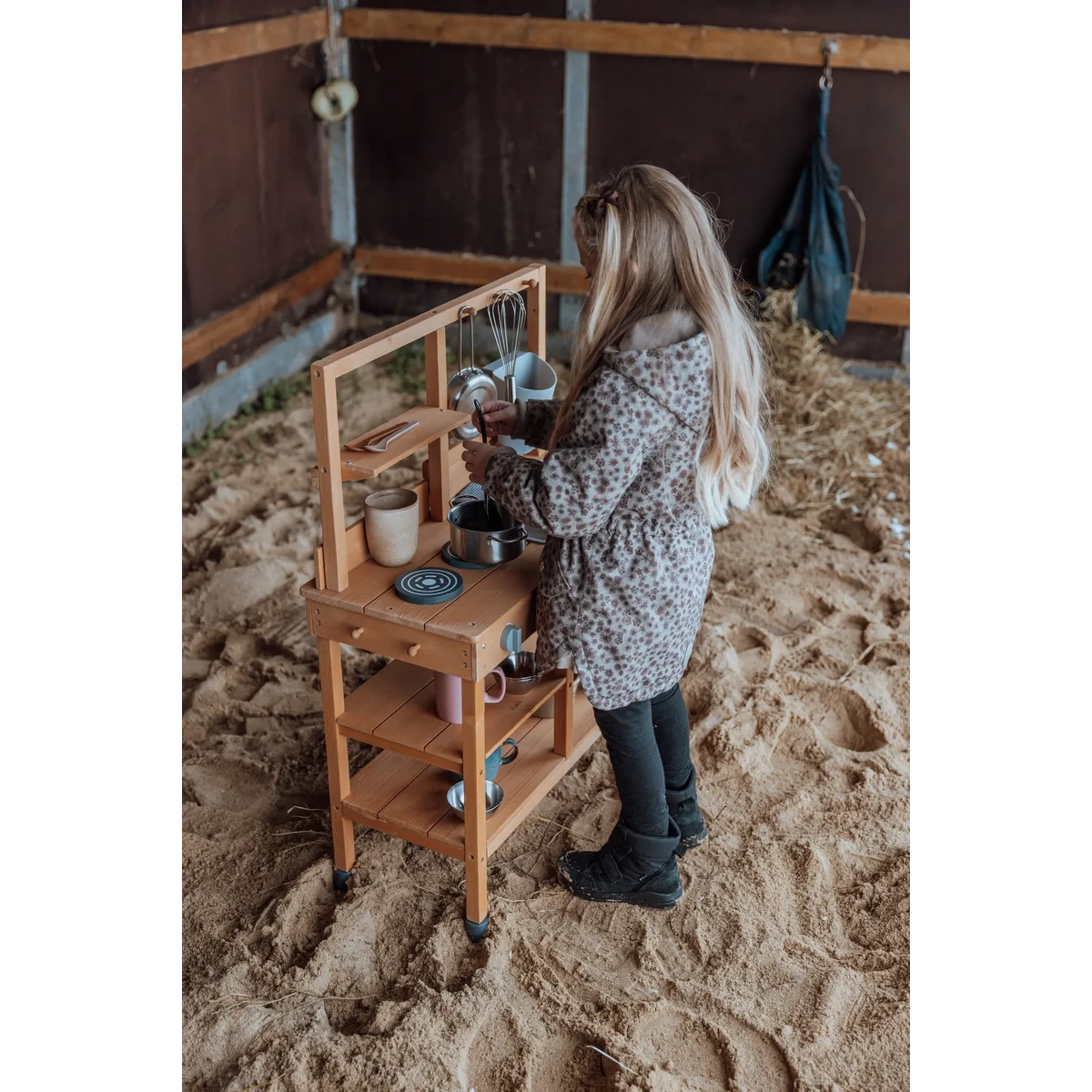 Deze speelkeuken is gemaakt van hoogwaardig hout en is gebouwd om lang mee te gaan en bestand te zijn tegen de elementen. Het is de perfecte aanvulling op de achtertuin of speelplek van uw kind. Een leuke, leerzame en interactieve ervaring die natuur, creativiteit en buitenspelen samenbrengt!